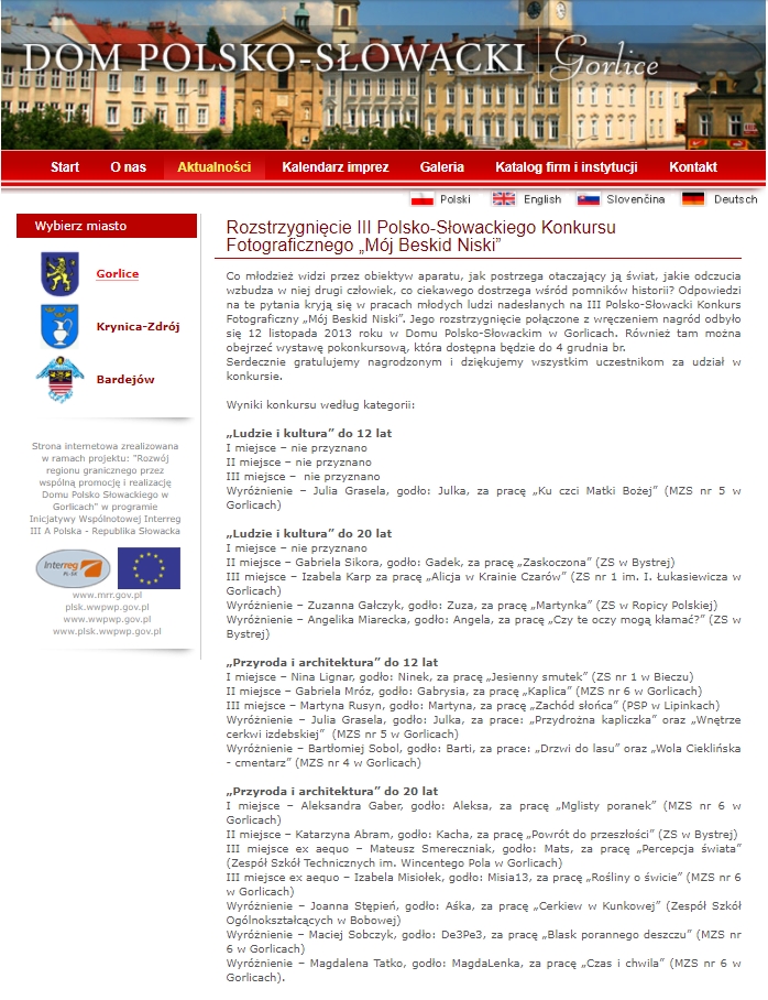 III Polsko-Słowacki Konkurs Fotograficzny Dnia 12 listopada w Domu Polsko- Słowackim w Gorlicach odbyło się otwarcie wystawy pokonkursowej i rozstrzygnięcie III Polsko- Słowackiego Konkursu Fotograficznego "Mój Beskid Niski". Podczas wernisażu dyplom za uczestnictwo otrzymali Sylwia Pianowska, i Dominik Ryba, a Mateusz Smereczniak dyplom i nagrodę za zajęcie III miejsca w kategorii "Przyroda i architektura". |