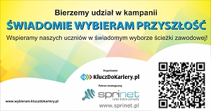 Niewątpliwie niezawodnym kluczem do kariery jest świadomy wybór swojej przyszłości oparty międzyinnymi naznajomości swoich mocnych stron,zainteresowań i predyspozycji, a także umiejętności planowania swojej drogi zawodowej.Dlatego nasz szkoła po raz kolejny już przystąpiła do ogólnopolskiej kampanii społecznej "Świadomie wybieram przyszłość".
