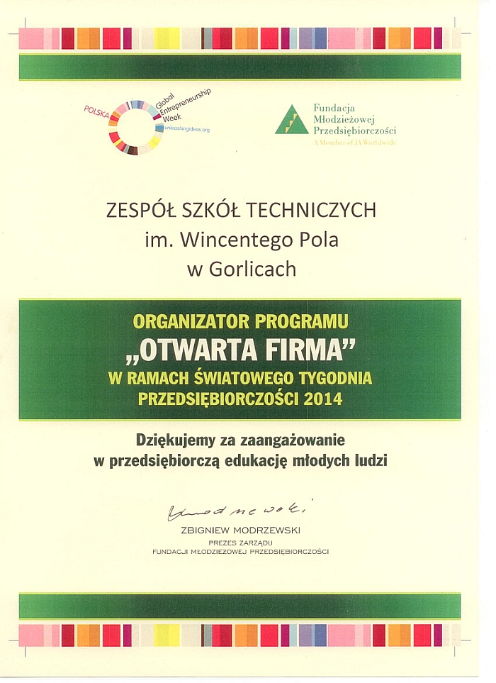 KOLEJNY PRESTIŻOWY CERTYFIKAT…___W dniu 17 listopada 2014r podczas XVII Konferencji Naukowej w Tarnowie dyrektor Zespołu Szkół Technicznych mgr Renata Stępień odebrała Certyfikat Szkoły Promującej Zdrowie - jedyny w powiecie gorlickim dla szkoły ponadgimnazjalnej. |