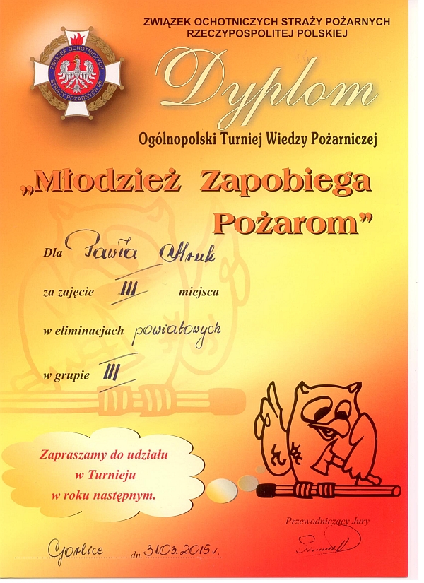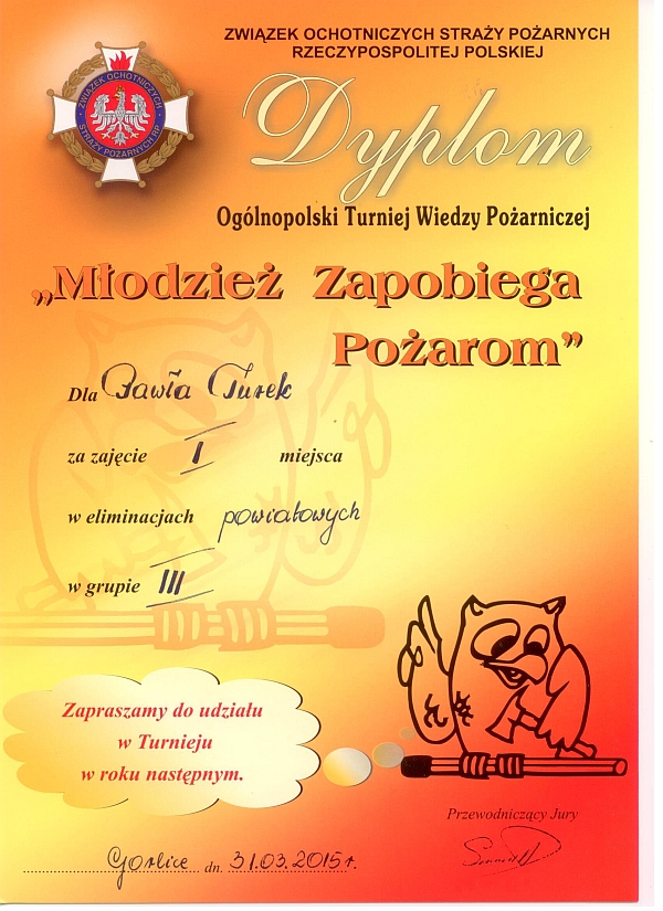 XXXVIII Eliminacje Powiatowe Ogólnopolskiego Turnieju Wiedzy Pożarniczej___Paweł Turek z klasy II ZSZ już drugi rok z rzędu wygrywa