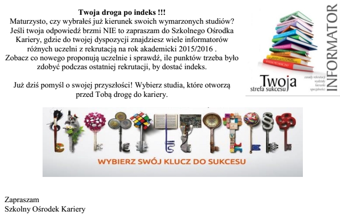 Zaprzyjaźnieni z rynkiem pracyW dniach od 20-24 października 2014r. odbywały się w naszej szkole warsztaty, spotkania, prelekcje i wiele innych imprez, a wszystko to w ramach VI edycji Ogólnopolskiego Tygodnia Kariery. Tegoroczne hasło OTK brzmiało „Jak zaprzyjaźnić się z rynkiem pracy”. Choć przyjaźń to niełatwa i czasami bolesna zdecydowanie warto ją pielęgnować i rozwijać. Rynek pracy zmienia się tak szybko i dynamicznie, że trudno być zawsze na bieżąco, jednak przynajmniej od czasu do czasu warto poświęcić chwilkę na sprawdzenie „co słychać”, co się zmienia w naszym obszarze zainteresowań, w naszej branży, co warto poznać, jakie umiejętności bądź kwalifikacje zdobyć. |
