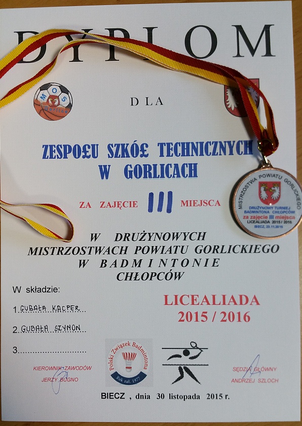 ![]() | Skok wzwyż w Lipinkach___ Bardzo dobry występ naszej trzyosobowej ekipy w VI OTWARTYCH MISTRZOSTWACH LIPINEK W SKOKU WZWYŻ. Wszyscy nasi zawodnicy zajęli pierwsze miejsca w swoich kategoriach wiekowych. Reprezentowali nas: Małgorzata Śliwa z klasy IIIcT, Łukasz Augustyn z klasy IIIaT oraz Dawid Klara z klasy IaT. Gratulujemy! |