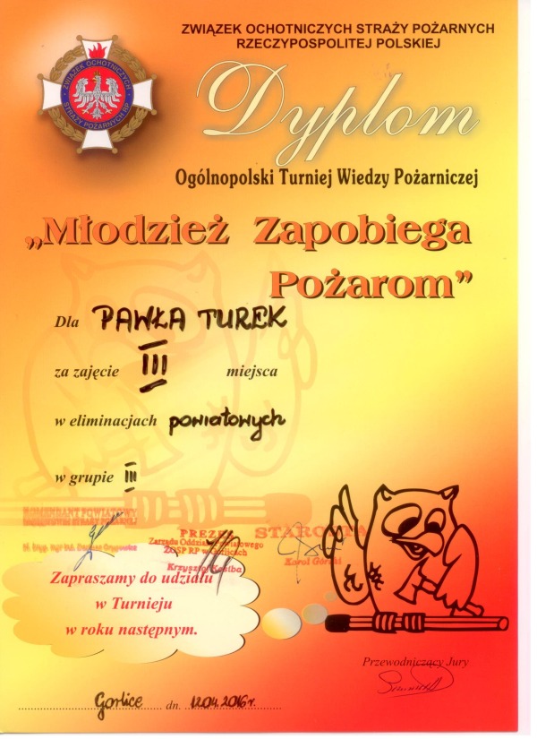 Turniej Wiedzy Pożarniczej___12 kwietnia odbyły się Eliminacje Powiatowe Ogólnopolskiego Turnieju Wiedzy Pożarniczej "Młodzież zapobiega pożarom". W w kategorii szkoły ponadgimnazjalne uczeń Paweł Turek z klasy III ZSZ zajął III miejsce. |