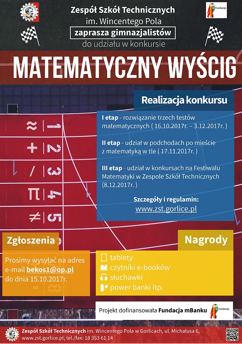 "Podchody matematyczne"17 grudnia 2017r uczniowie Zespołu Szkół Technicznych pod opieką nauczycieli p.Beaty Kosiby-Hućko i p.Doroty Zimowskiej zorganizowali dla swoich kolegów z ZST i gimnazjalistów biorących udział w konkursie „Matematyczny Wyścig”, kilkugodzinne podchody po Gorlicach. Trzy lub dwo-osobowe drużyny uczniów dostawały wskazówki do dalszej gry, jeżeli w poszczególnych punktach rozwiązały zadania i łamigłówki matematyczne oraz zadania związane z historią i geografią Gorlic. W strugach deszczu uczniowie wraz z opiekunami dzielnie pokonywali kolejne punkty związane nierozerwalnie z naszym miastem: Dwór Karwacjanów, Ławeczkę Ignacego Łukasiewicza, Pomnik Tereski Kosibianki, najstarszą kapliczkę na ulicy Krętej, kapliczkę przy ul. Węgierskiej aż dotarły do finałowego punktu programu – ścieżki zdrowia. Uczestnicy dopisali – w podchodach wzięło udział ponad 30 drużyn z 10 okolicznych gimnazjów i z Zespołu Szkół Technicznych. Wszyscy byli doskonale przygotowani do pytań związanych z Gorlicami, szybko rozwiązywali także zadania i łamigłówki matematyczne. Brzydka pogoda nie zepsuła wspaniałej zabawy. Wszystkim uczniom i ich opiekunom serdecznie dziękujemy za udział w podchodach! Nagrody za udział w poszczególnych etapach Konkursu „Matematyczny Wyścig” będą wręczone podczas Festiwalu Matematyki, który odbędzie się 8 grudnia w Zespole Szkół Technicznych. |
