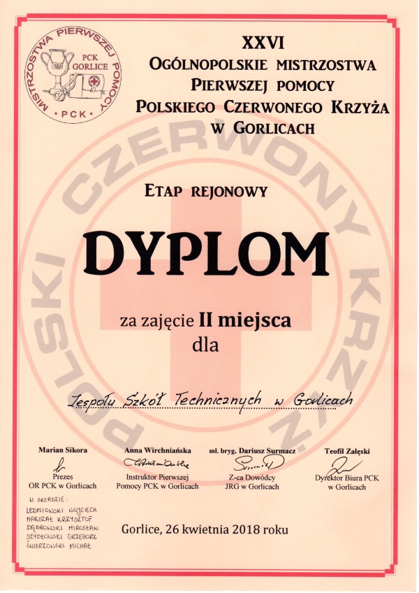 i Ustawicznego w Gorlicach odbyły się Eliminacje Powiatowe Ogólnopolskiego Turnieju Wiedzy Pożarniczej "Młodzież zapobiega pożarom". W rozegranym Turnieju w kategorii szkoły ponadgimnazjalne naszą szkołę reprezentowali: Wojciech Ledniowski z klasy IV c T, oraz Michał Świerzowski z II a T. W finale turnieju Wojciech Ledniowski zajął III miejsce. Opiekunem był mgr Andrzej Kopcza.