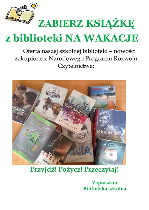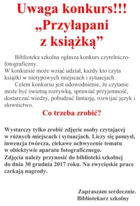 "UPOLUJ SWOJĄ KSIĄŻKĘ"Nasza szkoła, jako jedna z dwóch w Gorlicach, została zakwalifikowana do akcji organizowanej przez portal Czytaj.pl. Znalazła się zarazem wśród 1000 szkół uczestniczących w pierwszej edycji projektu „Upoluj swoją książkę”. Dzięki niemu uczniowie i nauczyciele mogli zupełnie za darmo przeczytać 12 bestselerowych e-booków i audiobooków. W ramach projektu szkoła otrzymała specjalne plakaty reklamujące książki z kodem QR za pomocą którego uczniowie otrzymali darmowy dostęp do książek w formie e-booka