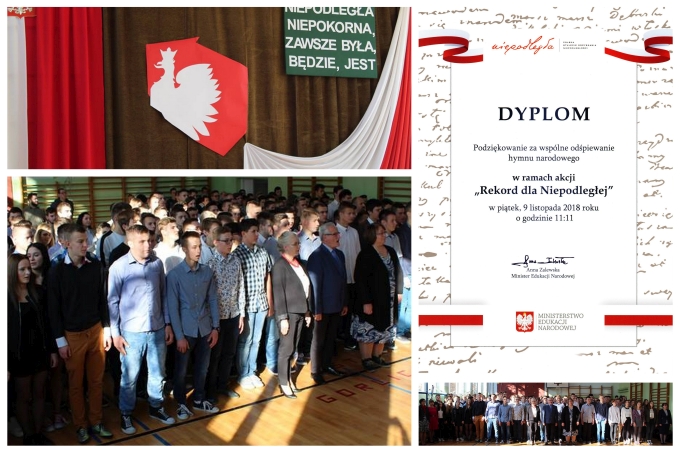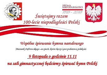 | W dniu 9 listopada o godzinie 11.11 na Sali gimnastycznej młodzież wraz z nauczycielami naszej szkoły odśpiewała Polski Hymn Narodowy. To wydarzenie było częścią obchodów setnej rocznicy odzyskania niepodległości. Jak przystało na śpiewanie Hymnu Państwowego, odbyło się ono w atmosferze skupienia w postawie „na baczność”. Odśpiewano wszystkie cztery zwrotki posiłkując się tekstem wyświetlonym na dużym ekranie. Po odśpiewaniu hymnu , młodzież zaśpiewała pięknie jeszcze cztery pieśni. Były to: „Legiony”, „Rota”, „Serce w Plecaku” oraz „Ojczyzno ma” (pieśń patriotyczna z okresu Solidarności).