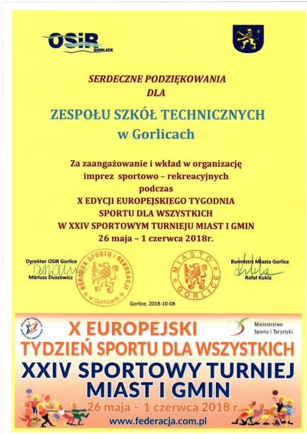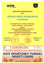 Gorlice najlepsze 8 października na uroczystej gali w Gorlickim Centrum Kultury odbyło się podsumowanie XXIV Sportowego Turnieju Miast i Gmin – Małopolska 2018. Gorlice w Turnieju w grupie miast od 15-40 tys. mieszkańców zajęło w skali kraju II miejsce, a w województwie małopolskim I. Mieliśmy w tym jak co roku znaczący udział, co zostało zauważone i jako jedyna szkoła ponadpodstawowa w powiecie zostaliśmy wyróżnieni na gali, w której uczestniczyła p. Dyrektor Renata Stępień. | ![]() |