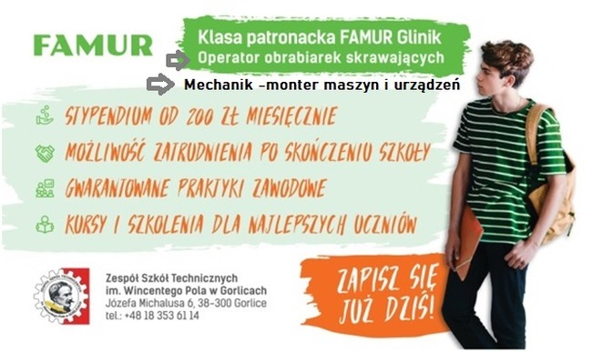 Zawód operator obrabiarek skrawających z patronatem Firmy Famur Dzięki podpisanej umowie uczniowie naszej szkoły, którzy we wrześniu rozpoczną naukę w Branżowej Szkole I Stopnia w tym zawodzie będą mieli możliwość praktycznej nauki zawodu w nowoczesnej i zaawansowanej technologicznie firmie, dając im tym samym pierwszy kontakt ze światem produkcji na etapie nauki – i co najważniejsze – uzyskają gwarancję zatrudnienia. Dodatkowym atutem jest atrakcyjny system stypendialny ufundowany przez Firmę Famur dla uczniów klasy patronackiej osiągających wymagane wyniki w nauce w wysokości np.: w pierwszym rok nauki 200 zł miesięcznie. |