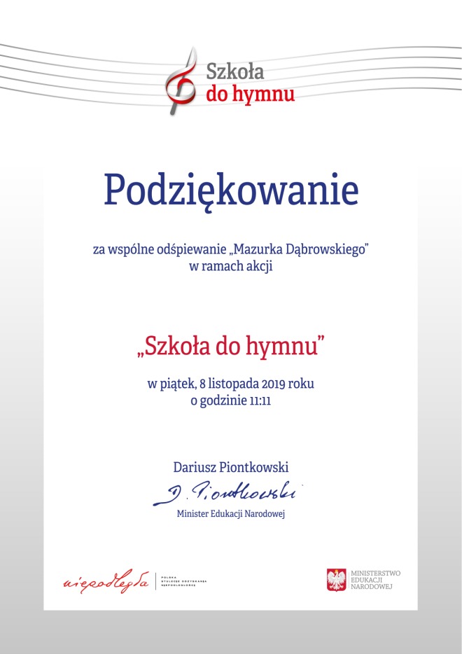 Akademia z okazji 101 rocznicy odzyskania przez Polskę niepodległości.8 listopada, w piątek, w naszej szkole miała miejsce akademia o okazji 101 rocznicy odzyskania przez Polskę niepodległości, w której wzięła udział cała społeczność szkolna. Włączając się w ogólnopolską akcję ogłoszoną przez Ministerstwo Edukacji Narodowej, na początku uroczystości wspólnie odśpiewany został hymn narodowy w pełnej wersji.