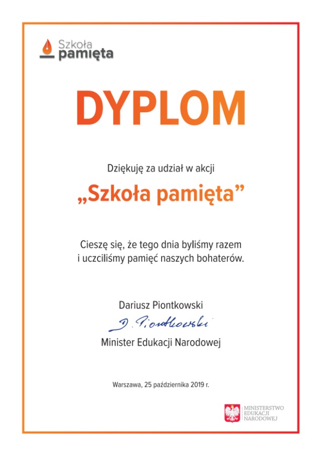 Włączeni w akcję "Szkoła pamięta"Nasza szkoła przystąpiła do akcji: "Szkoła pamięta" której organizatorem jest Ministerstwo Edukacji Narodowej. Celem tej inicjatywy jest zorganizowanie działań upamiętniających ważne postacie oraz wydarzenia wiązane z regionem i lokalną społecznością.