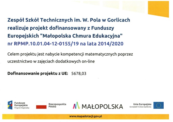 Małopolska Chmura EdukacyjnaW roku szkolnym 2019/2020 kilkunastu uczniów z klasy IIa i IIb technikum ZST będzie uczestniczyć w zajęciach on-line z Matematyki z elementami rachunkowości w ramach Małopolskiej Chmury Edukacyjnej. Zajęcia te będą prowadzone przez wykładowców Uniwersytetu Ekonomicznego w Krakowie i będą odbywać się w Bibliotece Pedagogicznej w Gorlicach. Pierwsze, organizacyjne spotkanie już za nami – odbyło się 30 października. Opiekunem uczniów jest p.Beata Kosiba-Hućko. |
