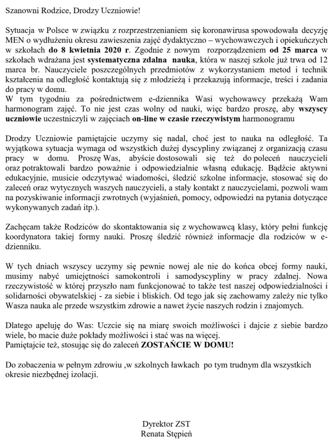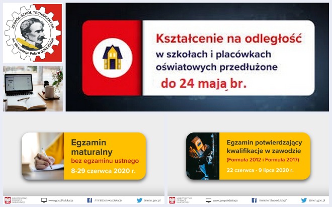 Przedłużenie nauki zdalnej do 24 majaMinister Edukacji Narodowej Rozporządzeniem z dnia 24 kwietnia 2020 r. zdecydował o przedłużeniu przerwy w nauczaniu stacjonarnym do 24 maja br. Tak więc lekcje nadal będą odbywały się zdalnie. |