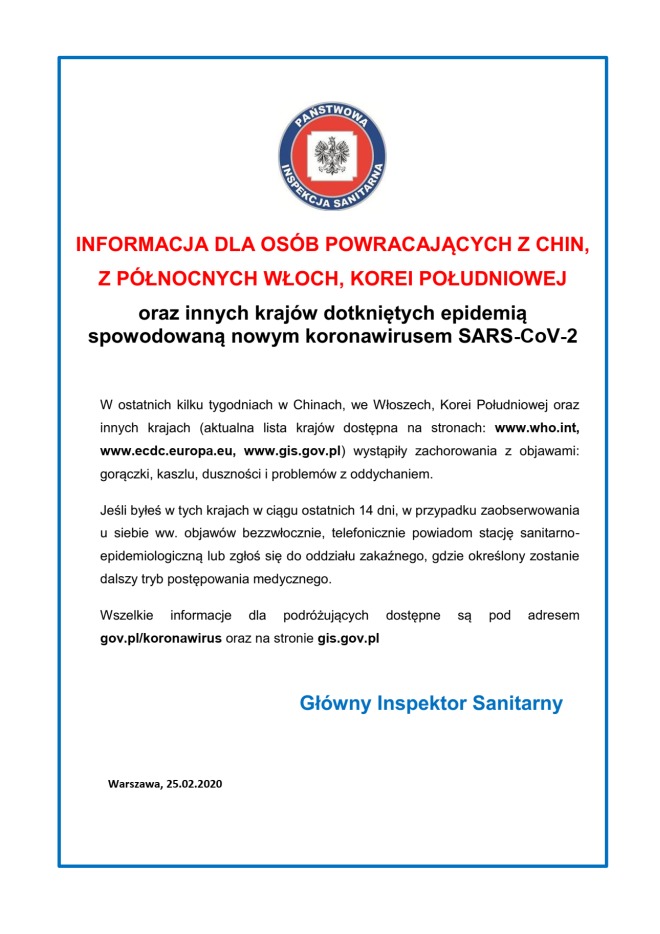 ![]() SZCZEGÓŁOWA INFORMACJA GŁÓWNEGO INSPEKTORA SANITARNEGO DLA OSÓB POWRACAJĄCYCH Z PÓŁNOCNYCH WŁOCH (.pdf) O koronowirusie ze strony Ministerstwa Zdrowia |